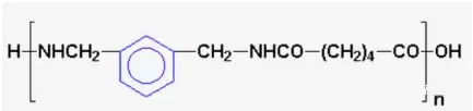 尼龍-mxd6是由三菱氣體化學(xué)公司從m-xylenediamine(mxda)生產(chǎn)的廣泛的聚酰胺的通用名稱。它是由間苯二甲胺mxda與己二酸的縮聚而產(chǎn)生的結(jié)晶聚酰胺。與尼龍6和尼龍66不同,尼龍mxd6是一種脂肪族聚酰胺,其主鏈中含有一個(gè)芳環(huán)?;瘜W(xué)結(jié)構(gòu)如下: